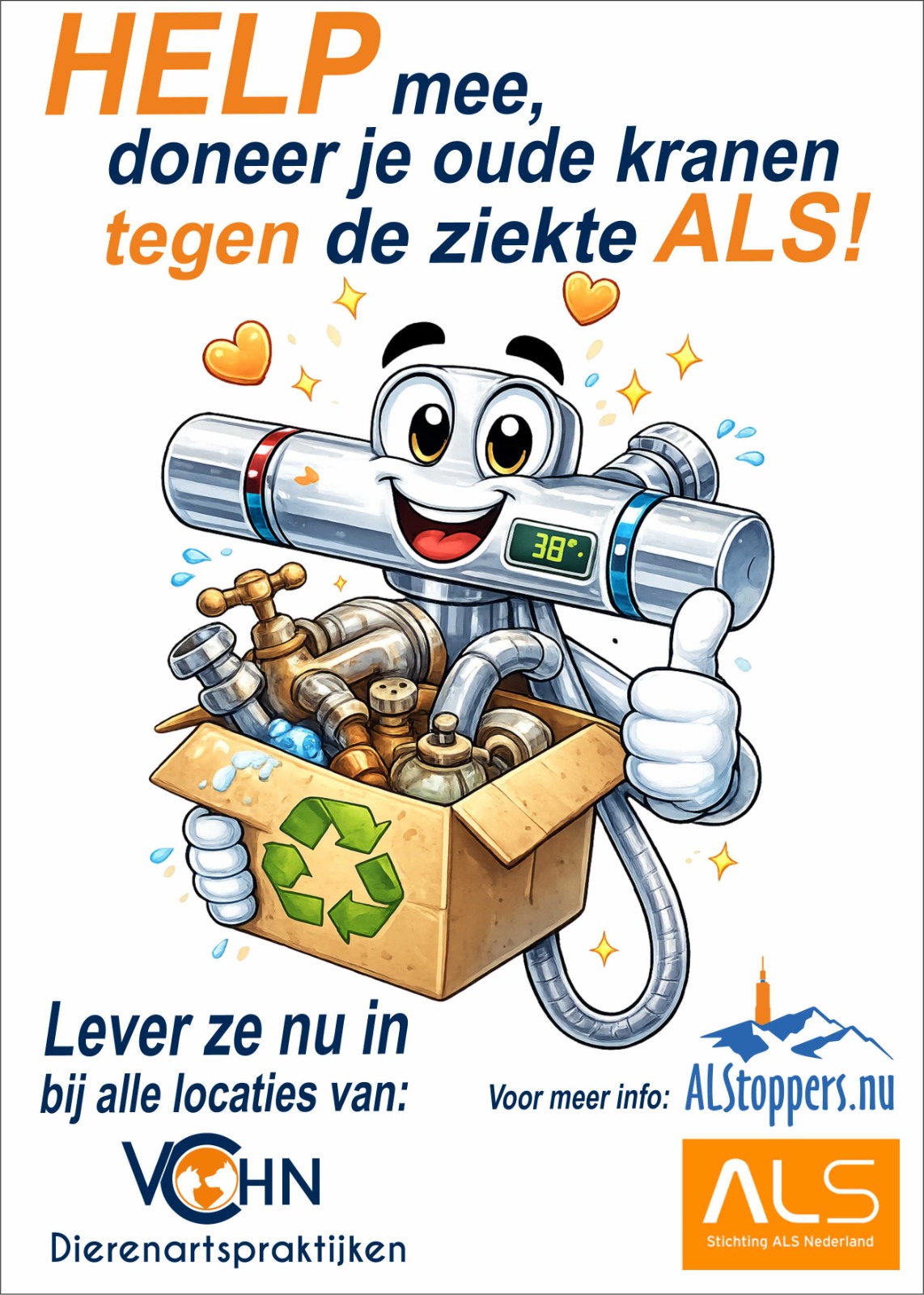 Team ALStoppers zet zich in om geld in te zamelen en zodoende onderzoek naar oorzaak en behandeling van de genadeloze ziekte ALS mogelijk te maken. Er zijn verschillende sponsorvormen uitgewerkt. Zo is er voor elk wat wils. Naast de permanent doorlopende inzamelacties betreffende oude mobieltjes en lege cartridges (geen toners) is er nu ook een nieuwe inzamelactie van start gegaan: (oude) kranen en/of toebehoren.